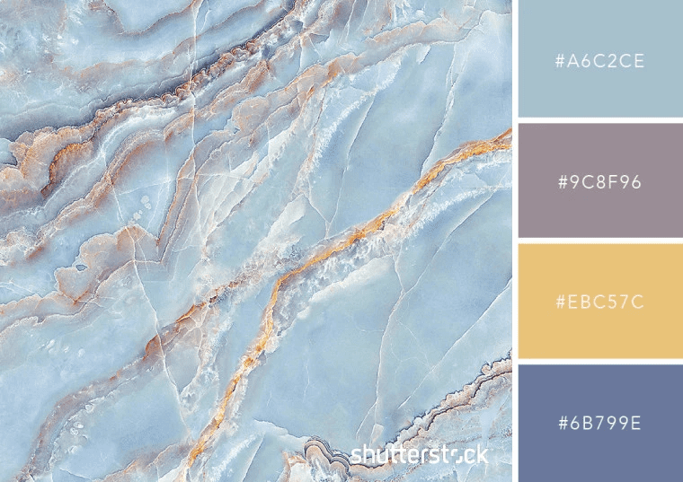 蓝色搭配较暖的色调,如橙色或黄色,是一个很好的着眼点。不妨使用现成的互补色、三等分色或相似色的配色表来调配自己的配色。或者,如果你选的构图较柔和,可将蓝色调和蓝色度与暖系强调色相结合,如下面的大理石纹理所示。